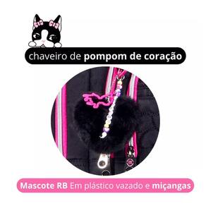 Mochila de rodinhas: Possui um design moderno com detalhes exclusivos da personagem Rebecca Bonbon, a adorável bulldog francesa, estampada em cores vibrantes. As rodinhas facilitam o transporte, evitando o peso nas costas, e a alça retrátil ajustável é ergonômica, oferecendo conforto. A mochila conta com um amplo espaço interno para cadernos, livros e materiais escolares, além de bolsos laterais para garrafinhas e pequenos objetos.