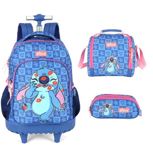 Características: Marca: Luxcel Linha: Disney Stitch Cor: AZUL Material: 100% poliéster Cód.:MC47741SCAZ Conteúdo do kit: 1 mochila de rodinhas, 1 lancheira e 1 estojo triplo