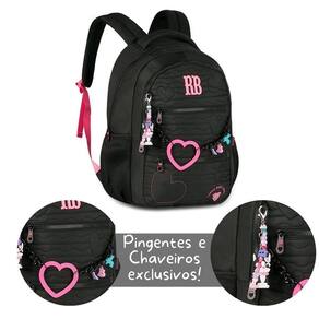A mochila premium Rebecca Bonbon é confeccionada em material soft com acabamento matelassê em formato de corações, disponível em cores irresistíveis: preto, rosa e roxo. Além do amplo compartimento principal com espaço para notebook, ela conta com dois bolsos frontais com zíper, bolsos laterais telados e bolso antifurto na parte traseira. Acompanha ainda chaveiro exclusivo de miçangas com mascote 3D, corrente estilizada com coração emborrachado e puxadores personalizados. Suas alças acolchoadas, ajustáveis e confortáveis, junto à alça carona e à alça de mão reforçada, garantem praticidade no transporte.