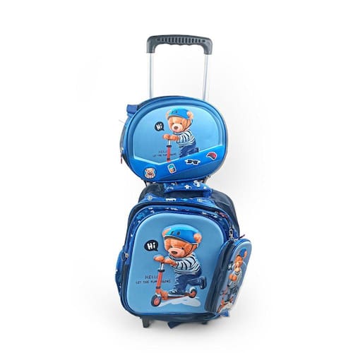 Detalhes: Kit Mochila Escolar Infantil com 3 Bags : Estojo, Lancheira térmica e Mochila com manopla transportadora de rodinhas deslizantes