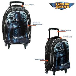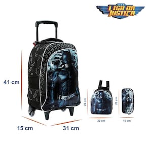 Kit Mochila Escolar Infantil DC Batman Liga da Justiça Com Rodinhas, acompanha lancheira e estojo. Agora você pode levar sua mochila do Batman no seu dia a dia ou acompanhar você na escola. Possui alça de mão reforçada. Sua abertura maior se dá por zíper com puxador. Na parte de dentro possui amplo espaço para a guardar diversos materiais como cadernos, livros e estojos. Na parte da frente, possui bolso com zíper para a guardar pertences de menor tamanho, e bolsos laterais.