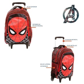 Kit Mochila Escolar Infantil Homem Aranha Marvel de Rodinhas, acompanha lancheira e estojo. Agora você pode levar sua mochila do Homem Aranha no seu dia a dia ou acompanhar você na escola. Possui alça de mão reforçada. Sua abertura maior se dá por zíper com puxador. Na parte de dentro possui amplo espaço para guardar diversos materiais como cadernos grandes, livros e estojos. Na parte da frente, possui bolso com zíper para guardar pertences de menor tamanho, e bolsos laterais.Características: Especificações: - Alça Superior - Estampa no Bolso Frontal - Puxador Retrátil- Zíper Personalizado- Bolso Lateral de Redinha Medidas do Estojo:- Altura: 10cm- Comprimento: 23cm Medidas da Lancheira:- Altura: 22cm- Largura: 20cm Medidas da Mochila: - Altura: 41cm- Largura: 15cm- Comprimento: 29cmDúvidas Frequentes:1. A mochila possui rodinhas em siliconeR. Sim, ela possui rodinhas em silicone transparente 2. Ela possui alça retrátilR. Sim, ela possui alça retrátil para ocupar menos espaço. 3. Ela possui quantas divisõesR. Ela possui 02 divisões para guardar suas coisas. 4. Qual o material da mochilaR. Ela é feita em poliéster e plástico. TagsMochila, escola, escolar, meninos, infantil, rodinha, personagem, desenho, heróis, material, spider man, marvel, vingadores, avengers, kit. Marca: Toys 2U