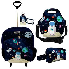 Conteúdo da embalagem: 01 mochila com carrinho fixo + 01 lancheira + 01 necessaire plus + 01 chaveiro