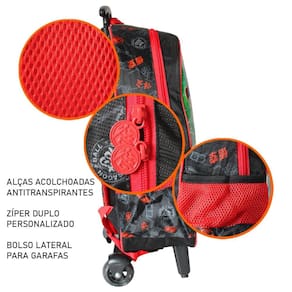 - 01 Compartimento interno espaçoso. - 02 Bolsos laterais de redinha para levar garrafas e itens menores. - Rodinhas de silicone. - Alça de costas. - Alça de mão. - As alças de costas são ajustáveis. - Zíper duplo personalizado. - Alças antitranspirantes.