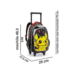 Características do produto: mochila de rodinha - Composição: 70% Poliéster 30% PVC - Rodinhas de silicone de alta resistência - 2 bolsos laterais para garrafa e objetos pequeno - Alças reforçada - Alças de ombro acolchoadas - Alça de mão acolchoada - Puxadores de zíper personalizada - Identificador no verso - Tamanho com rodinhas aproximado: 41,5cm x 29cm x 17,5cm - Altura total com haste puxado: 75cm