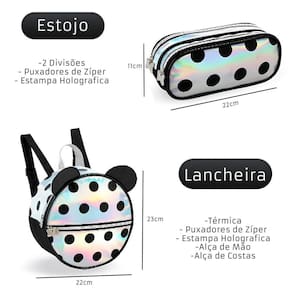 Lancheira: Mantenha as energias altas com a lancheira térmica que mantém os alimentos fresquinhos. Alças ajustáveis garantem o ajuste perfeito para os ombros pequenos. O fundo holográfico transforma cada pausa para o lanche em uma experiência única.