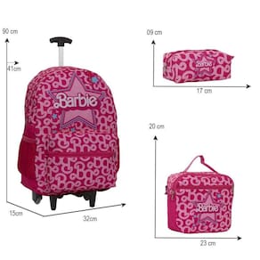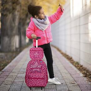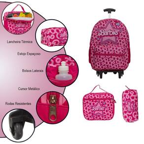 Kit Mochila Escolar Infantil Barbie Rodinhas, acompanha lancheira e estojo. Possui alça de mão reforçada. Agora você pode levar sua mochila no seu dia a dia ou acompanhar você na escola. Sua abertura maior se dá por zíper com puxador. Na parte de dentro possui amplo espaço para a guardar diversos materiais como cadernos, livros e estojos. Na parte da frente, possui bolso com zíper para a guardar pertences de menor tamanho e bolsos laterais.