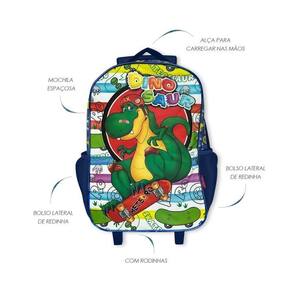 Kit Mochila Infantil Escolar com 03 Peças Dinossauro Azul Kit Mochila Infantil Escolar com 03 Peças Dinossauro Azul ===================================== Vem com uma mochila de rodinhas com compartimento principal espaçoso ideal para acomodar os livros, cadernos e materiais escolares no geral e mais dois bolsos laterais de redinha para garrafas.
