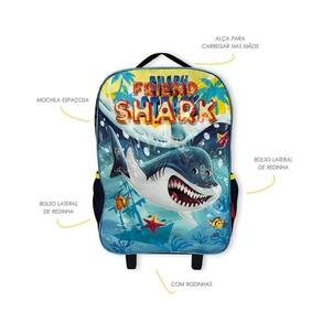 Especificações: - Material: Poliéster - Medida Mochila: 41cm x 30cm x 17cm - Medida Lancheira: 18cm x 22cm x 09cm - Medida Estojo: 23cm x 07cm - Capacidade Mochila: 20 Litros - Capacidade Lancheira: 3,5 Litros - Com Rodinha: Sim - Peso: 800 gramas - Cor: Amarelo - Estampa: Tubarão