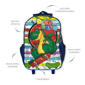 Mochila de rodinhas com compartimento principal espaçoso para livros e materiais escolares Dois bolsos laterais em redinha para garrafas, garantindo praticidade Lancheira térmica com espaço ideal para manter o lanchinho fresco Alças versáteis para transporte: mão, ombro ou encaixe na mochila Estojo para organizar lápis de cor e canetinhas de forma prática Design divertido com estampa de dinossauro, atraente para as crianças