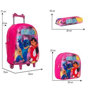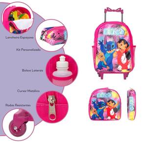 Kit Mochila Escolar Infantil Stitch Rodinhas, acompanha lancheira e estojo. Possui alça de mão reforçada. Agora você pode levar sua mochila no seu dia a dia ou acompanhar você na escola. Sua abertura maior se dá por zíper com puxador. Na parte de dentro possui amplo espaço para a guardar diversos materiais como cadernos, livros e estojos. Na parte da frente, possui bolso com zíper para a guardar pertences de menor tamanho e bolsos laterais.