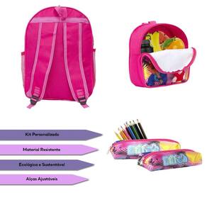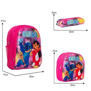 Kit Mochila Escolar Infantil Stitch, acompanha lancheira e estojo. Possui alça de mão reforçada. Agora você pode levar sua mochila no seu dia a dia ou acompanhar você na escola. Sua abertura maior se dá por zíper com puxador. Na parte de dentro possui amplo espaço para a guardar diversos materiais como cadernos, livros e estojos. Na parte da frente, possui bolso com zíper para a guardar pertences de menor tamanho e bolsos laterais.
