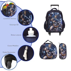 Kit Mochila Escolar Infantil Batman Rodinhas, acompanha lancheira e estojo. Possui alça de mão reforçada. Agora você pode levar sua mochila no seu dia a dia ou acompanhar você na escola. Sua abertura maior se dá por zíper com puxador. Na parte de dentro possui amplo espaço para a guardar diversos materiais como cadernos, livros e estojos. Na parte da frente, possui bolso com zíper para a guardar pertences de menor tamanho e bolsos laterais.