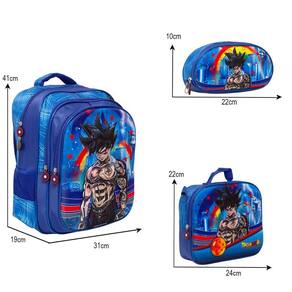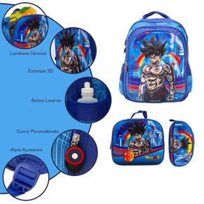 Kit Mochila Escolar Infantil Dragon Ball, acompanha lancheira e estojo. Possui alça de mão reforçada. Agora você pode levar sua mochila no seu dia a dia ou acompanhar você na escola. Sua abertura maior se dá por zíper com puxador. Na parte de dentro possui amplo espaço para a guardar diversos materiais como cadernos, livros e estojos. Na parte da frente, possui bolso com zíper para a guardar pertences de menor tamanho e bolsos laterais.