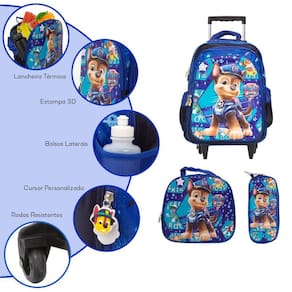 Kit Mochila Escolar Infantil Patrulha Canina Rodinhas, acompanha lancheira e estojo. Possui alça de mão reforçada. Agora você pode levar sua mochila no seu dia a dia ou acompanhar você na escola. Sua abertura maior se dá por zíper com puxador. Na parte de dentro possui amplo espaço para a guardar diversos materiais como cadernos, livros e estojos. Na parte da frente, possui bolso com zíper para a guardar pertences de menor tamanho e bolsos laterais.