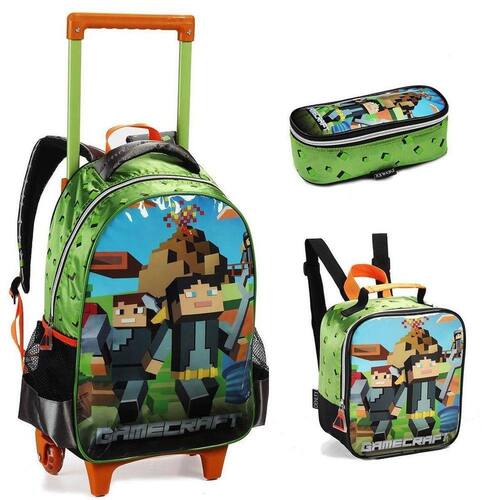 Possui ótimo espaço interno para transportar livros e cadernos, mochila resistente para uso de dia dia. Design moderno e estampa autêntico.CARACTERÍSTICAS:Mochila: Contém: Mochila de carrinho 15 (polegadas), lancheira e estojo.Medidas da mochila: (38 x 29 x 15 cm).Composição: 100% PoliésterPuxador personalizadoIdentificador no versoRodas de siliconeCarrinho embutidoLancheira: Medidas da lancheira: (24 x 19 x 11 cm)Composição: 100% PoliésterSistema térmicoAlça nas costasElástico interno para fixação da garrafaElástico nas costas para fixação no carrinhoIdentificador no versoEstojo:Medidas do estojo: (21 x 12 x 6 cm)Composição: 100% PoliésterPuxador personalizadoUma divisória
