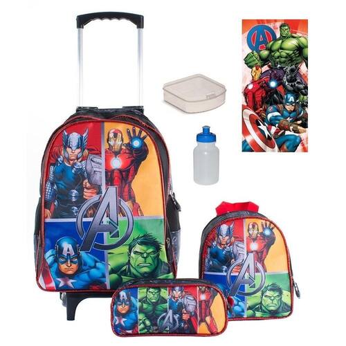 Kit mochila infantil rodinhas vingadores+ lancheira + estojo Mochila de rodinhas infantil masculina vingadores com lancheira térmica e estojo combinando na mesma estampa ideal para escola ou viagem. Mochila exclusiva para quem procura qualidade, estilo, modernidade e praticidade. Possui um ótimo espaço já que contém dois compartimentos com zíper e dois bolsos externos laterais. Suficiente para carregar livros, cadernos, agenda e estojo. Vem junto lancheira térmica que encaixa no carrinho de mão e conserva temperatura de alimentos e bebidas. Ideal para uso escolar ou viagem. Estampa atual, versátil e indispensável no dia-a-dia.