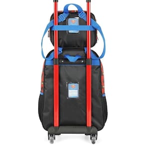 Kit mochila de rodinhas com bolsos laterias em tela com elástico, não possui alças de costas, silk frontal, alça de mão. Lancheira estampada com alça de costas e alça de mão, além de etiquetas personalizadas.