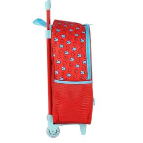 Kit mochila de rodinhas com bolsos laterias em tela com elástico, não possui alças de costas, silk frontal, alça de mão. Lancheira estampada com alça de costas e alça de mão, além de etiquetas personalizadas.