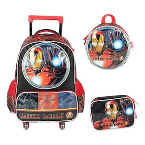 Esse lindo kit escolar avengers e homem de ferro vai fazer sucesso entre a garotada. Esse modelo conta com 3 compartimentos e dois bolsos laterais para colocar a garrafa. Possui 4 rodinhas de silicone com led e giros 360º.
