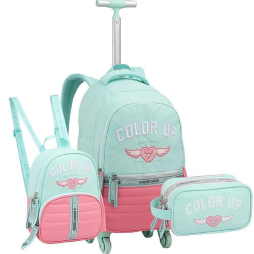 Kit mochila de roda 18 color up estojo e lancheira térmica - seanite Descubra o kit mochila de roda 18 color up, a escolha ideal para crianças que buscam estilo e funcionalidade este kit completo inclui uma mochila escolar de rodinha, um estojo prático e uma lancheira térmica, tudo com um design colorido e atraente. A mochila de rodinhas é feita de materiais duráveis, perfeita para o dia a dia escolar, oferecendo amplo espaço para livros e cadernos, além de bolsos laterais para garrafinhas. O estojo organizador mantém os materiais escolares sempre à mão, enquanto a lancheira térmica mantém os lanches frescos. Com alças ajustáveis e rodinhas de alta qualidade, este kit é a solução perfeita para a volta às aulas. Garanta agora o kit e transforme o cotidiano da sua filha em uma verdadeira aventura Características mochila : - dois compartimentos - bolso frontal - bolsos laterais porta garrafa - bolso interno para laptop - puxadores personalizados - detalhes bordados - chaveiro de pelúcia removível - carrinho embutido com 2 níveis de extensão e botão de trava - 4 rodas de silicone com gira 360º Especificações mochila : Marca: seanite Peso: 900g Capacidade: 23l Material: 100% poliéster Medidas aprox. l x a x p : 33 x 46,5 x 15 cm Características lancheira : - sistema térmico - bolso frontal - bolso lateral porta garrafa - alça costas reversível para transversal - elástico interno para fixação de garrafa - detalhes bordados - puxadores personalizados Especificações lancheira : - medidas aproximadas l x a x p : 20 x 26 x 10 cm - composição do produto: 100% poliéster - marca: seanite Características estojo : - dois compartimentos - puxadores personalizados - alça lateral Especificações estojo : Marca: seanite Peso: 200g Capacidade: 100 lápis Material: 100% poliéster Medidas aprox. l x a x p : 21 x 12 x 10 cm Conteúdo da embalagem: Mr42206 - 1 mochila de roda 18 color up Es42209 - 1 estojo duplo La42208 - 1 lancheira térmica As cores podem variar entre as imagens mostradas acima e o produto. Imagens meramente ilustrativas. Todas as informações divulgadas são de responsabilidade exclusiva do fabricante. de 90 dias contra defeito de fábrica.