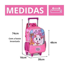 Alça retrátil em alumínio Rodinhas reforçadas Bolso frontal com zíper Bolsos laterais em tela Capa estampada com tema Gatinha Nini