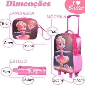 Delicadeza e encanto definem o kit de mochila de rodinhas feminina Com um design em rosa vibrante e glitter sutil, complementado pela estampa de uma linda bailarina, este kit é perfeito para meninas que adoram brilhar e expressar sua paixão pela dança. Características da Mochila: Estilo Elegante: Rosa com glitter suave e estampa de uma bailarina encantadora, trazendo charme e leveza ao dia a dia escolar. Praticidade e Conforto: Rodinhas resistentes para facilitar o transporte. Alça de mão para maior versatilidade. Dois bolsos laterais ideais para garrafas ou itens pequenos de fácil acesso. Espaço e Organização: Compartimento principal grande com zíper, perfeito para armazenar livros, cadernos e outros materiais. Bolso externo adicional para organização extra. Dimensões: 41 cm de altura x 30 cm de largura x 17 cm de profundidade. Características da Lancheira: Isolamento Térmico: Mantém os alimentos frescos e protegidos para a hora do lanche. Divisão Única: Espaçosa e prática para armazenar refeições e snacks. Dimensões: 22,5 cm de altura x 18 cm de largura x 9 cm de profundidade. Características do Estojo: Compacto e Funcional: Divisão única para organizar lápis, canetas e outros acessórios escolares. Dimensões: 23,5 cm de comprimento x 7 cm de altura. Por que escolher este kit Design Encantador: A combinação de glitter, rosa e a delicada bailarina tornam este kit um verdadeiro sonho para as pequenas. Funcionalidade Completa: Espaço ideal para manter tudo organizado e à mão, além de materiais duráveis para o uso diário. Praticidade e Elegância: Perfeito para meninas que amam estilo e funcionalidade em um só produto. Transforme o dia a dia escolar em um verdadeiro espetáculo Este kit é a escolha perfeita para meninas que desejam brilhar com graça e praticidade. Marca: Não Informado Ean: 9422903209990