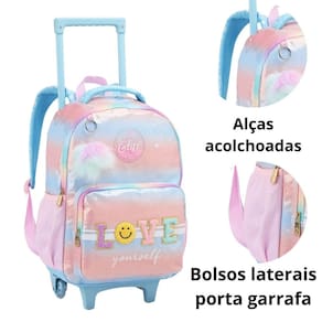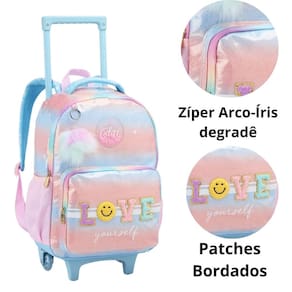 Mochila -Medidas:43cm x 31cm x 14cm -Bolso Frontal Com Zíper -Bolsos Laterais Porta Garrafa -Zíper Arco-Íris Degrade -Identificador No Verso -Puxadores Personalizados -Material Especial -Aplicação De Patches Bordados -Chaveiro De Pelúcia Removível -Carrinho Embutido Com Regulagem -Rodas De Silicone E Apoio Frontal -Material: 70% PU 30% Poliéster -Volume: 18L