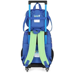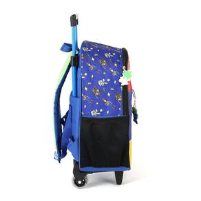 Kit mochila de rodinhas com bolsos laterias em tela com elástico, não possui alças de costas, silk frontal, alça de mão. Lancheira estampada com alça de costas e alça de mão, além de etiquetas personalizadas.