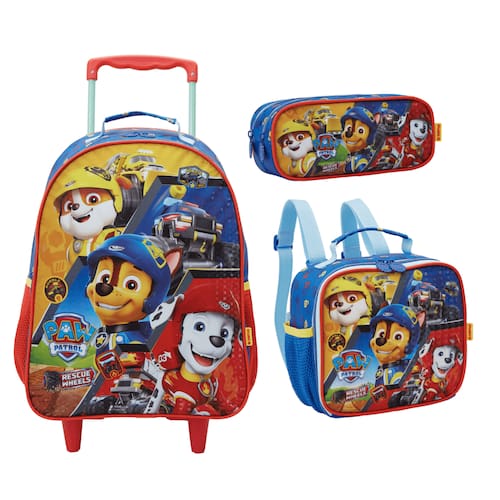 MOCHILAEncante os pequenos com a Mala com Rodas da Patrulha Canina - Rescue Wheels! Esta mala vibrante e colorida apresenta os personagens favoritos, Chase, Rubble, e Marshall, em uma emocionante aventura de resgate. A frente é feita de PVC reticulado, garantindo durabilidade e resistência extra, além de um acabamento texturizado que destaca ainda mais as ilustrações. Com um espaçoso compartimento principal, é perfeita para carregar livros, cadernos e outros materiais escolares. Os bolsos laterais em mesh são ideais para garrafas de água e pequenos itens. As rodinhas suaves e a alça retrátil proporcionam facilidade de transporte, garantindo conforto e praticidade para as crianças. Esta mochila combina funcionalidade e diversão!Detalhes EspeciaisPuxadores Personalizados: Em Metal pintado, os puxadores de zíper são personalizados com um design exclusivo, oferecendo um toque único à mochila.Bolsos Laterais: Perfeitos para armazenar garrafas de água, guarda-chuvas ou pequenos itens de acesso rápido.Técnica frontal: PVC reticulado.Alça de mão: tira de poliéster forrado com nylon.Carrinho: O carrinho promove mais conforto e praticidade para o dia a dia dos pais e crianças. Feito de Metal pintado e hastes arredondadas, possui travas de altura, 2 rodas em gel e freio frontal.Material:Poliéster 420DDIMENSÕES:- Largura: 30cm- Altura: 40cm- Comprimento: 15cmPESO: 800grLANCHEIRAFaça da hora do lanche um momento especial com a lancheira Patrulha Canina - Rescue Wheels! Com um design colorido e divertido, esta lancheira apresenta os personagens Chase, Rubble e Marshall em uma emocionante aventura de resgate. A frente de PVC reticulado proporciona durabilidade extra e um brilho especial que destaca as ilustrações. O compartimento único espaçoso é revestido com forro térmico de PEVA térmico, garantindo que os alimentos se mantenham frescos e na temperatura ideal. Além disso, ela possui um prático bolso lateral em mesh, perfeito para carregar uma garrafinha de água. Compacta e fácil de carregar, é ideal para a escola, passeios ou piqueniques. Leve a energia e a diversão da Patrulha Canina para todos os lugares com esta lancheira prática e resistente!.Detalhes EspeciaisPuxadores Personalizados: Em Metal pintado, os puxadores de zíper são personalizados com um design exclusivo, oferecendo um toque único à mochila.Bolso Lateral: Perfeito para armazenar garrafas de água ou pequenos itens de acesso rápido.Alças Ajustáveis: Garantem a adaptabilidade do produto, facilitando o uso para pessoas de diferentes tamanhos.Técnica frontal: PVC reticuladoAlça de mão: tira de poliéster forrado com nylon.Material:Poliéster 420DDIMENSÕES:- Largura: 19cm- Altura: 21cm- Comprimento: 10cmPESO: 160grESTOJOOrganize todos os materiais escolares com estilo com o estojo Patrulha Canina - Rescue Wheels! Com um design vibrante e cheio de energia, este estojo apresenta os adoráveis personagens Chase, Rubble e Marshall em uma emocionante aventura de resgate. A frente de PVC reticulado oferece durabilidade extra e um brilho especial que destaca as ilustrações. Com dois compartimentos espaçosos, é perfeito para guardar lápis, canetas, borrachas e outros itens essenciais de forma organizada. Feito com materiais de alta qualidade, é resistente e ideal para o uso diário. O fechamento em zíper garante que tudo fique seguro e acessível. Leve a diversão e a energia da Patrulha Canina para a sala de aula com este estojo prático e divertido!Detalhes EspeciaisPuxadores Personalizados: Em Metal pintado, os puxadores de zíper são personalizados com um design exclusivo, oferecendo um toque único à mochila.2 Compartimentos: Versátil e espaçoso.Técnica frontal: PVC reticuladoMaterial:Poliéster 420DDIMENSÕES:- Largura: 21.5cm- Altura: 9cm- Comprimento: 7cmPESO: 100gr