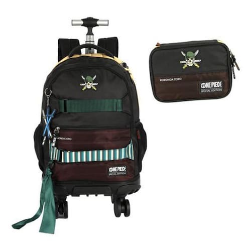 Kit Escolar Mochila com 04 Rodinhas DUPLAS com giros de 360º + Estojo 100 Pens. O carrinho é feito em alumínio e as quatro rodinhas duplas possuem giro 360, proporcionado leveza e facilidade ao transporte. O puxador é em forma de T, com botão para regular a altura. Ela também pode ser Utilizado nas costas pois possui alças ajustáveis e macias que se adaptam ao corpo. Vem com alça de mão fixa. Além de Contar com a novidade desse ano, o borrachão na parte da base que proporciona mais durabilidade e proteção do produto. A mochila é bastante espaçosa, perfeita para acomodar livros, ficheiros, cadernos e agenda. Na parte interna são duas divisões, com um compartimento para notebook. Os 4 compartimentos são fechados por zíper. - Carrinho em alumínio com puxador e rodinhas; - Alça de costas acolchoada; - Chaveiro Exclusivo - Logo em PU - Detalhe com FITA na partr frontal - Modelo Preto com Bandana do Personagem - Alça de mão reforçada; - Mochila super leve e resistente; - Rodinhas Duplas Giros 360 - Medidas: 46x34x22 cm AxLxP Estojo super resistente e espaçoso, com capacidade máxima de 100 lápis. Ele possui dois compartimentos separados por uma divisória e vem com 20 elásticos, 10 de cada lado, para prender lápis e canetas em separado. Ideal para crianças e adolescentes levarem à escola e manterem os materiais separados e em ordem. Medida: 6x15x21 cm AxLxC de 6 meses contra defeito de fabricação Dicas e Cuidados; Proteja os objetos pontiagudos ou cortantes evitando o contato direto com o produto. Guarde o produto e um local seco, fresco e arejado, para evitar a proliferação de fungos que podem danificar o produto. Para Limpeza, use apenas água morna e sabão neutro nas partes metálicas somente uma flanela seca. Nunca aplique produtos abrasivos, solventes ou quaisquer agentes químicos. Para secagem, Utilize apenas pano seco. Não exponha ao sol e altas temperaturas por um período de tempo prolongado. Apare sempre os fios soltos do tecido, para que eles não se prendam no zíper. Duvida Faça-nos uma pergunta : Marca: Não Informado