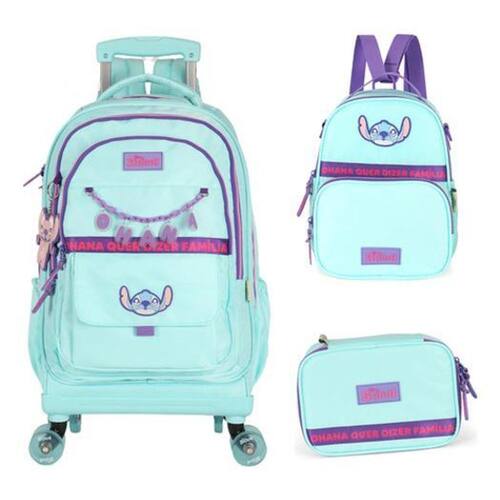 Kit Escolar Mochila com 04 Rodinhas Duplas com giros de 360º + Lancheira Térmica e Estojo 100 Pens, com compartimento para Notebook. O carrinho é feito em alumínio e as quatro rodinhas possuem giro 360, proporcionado leveza e facilidade ao transporte. Puxador com HASTE DUPLA, com botão para regular a altura. Ela também pode ser Utilizado nas costas pois possui alças ajustáveis e macias que se adaptam ao corpo. Vem com alça de mão fixa. Além de Contar com a novidade desse ano, o borrachão na parte da base que proporciona mais durabilidade e proteção do produto. A mochila é bastante espaçosa, perfeita para acomodar livros, ficheiros, cadernos e agenda. Na parte interna são duas divisões, com um compartimento para notebook. O compartimentos são fechados por zíper. - Carrinho em alumínio com HASTE DUPLA - Alça de costas acolchoada; - Alça de mão reforçada; - Um Logo Bordado e Outro Emborrachado - Chaveiro Pompom com orelhinhas - Mochila super leve e resistente; - Rodinhas Duplas Giros 360 - Medidas: 48x34x22 cm AxLxP Estojo super resistente e espaçoso, com capacidade máxima de 100 lápis. Ele possui dois compartimentos separados por uma divisória e vem com 20 elásticos, 10 de cada lado, para prender lápis e canetas em separado. Ideal para crianças e adolescentes levarem à escola e manterem os materiais separados e em ordem. Medida: 6x15x21 cm AxLxC Bolsa Lancheira Térmica, super-resistente; A lancheira é bastante espaçosa, perfeita para colocar potes com refeições e sanduíches, garrafas de água ou suco e frutas. Ideal para crianças e adolescentes levarem à escola ou adultos levarem para o trabalho, academia ou passeios ao ar livre. A lancheira contém uma alça regulável, que pode ser ajustada ou retirada quando necessário. Possui elástico na parte de trás, para acoplar em mochilas de carrinho. - Lancheira térmica super leve e resistente. - Alça regulável, com opção de retirada. - Fechamento em zíper. - Medidas: 27x20x12 cm AxCxL - Não acompanha potinho e garrafa. de 6 meses contra defeito de fabricação Dicas e Cuidados; Proteja os objetos pontiagudos ou cortantes evitando o contato direto com o produto. Guarde o produto e um local seco, fresco e arejado, para evitar a proliferação de fungos que podem danificar o produto. Para Limpeza, use apenas água morna e sabão neutro nas partes metálicas somente uma flanela seca. Nunca aplique produtos abrasivos, solventes ou quaisquer agentes químicos. Para secagem, Utilize apenas pano seco. Não exponha ao sol e altas temperaturas por um período de tempo prolongado. Apare sempre os fios soltos do tecido, para que eles não se prendam no zíper. Duvida Faça-nos uma pergunta :