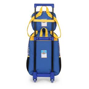 Kit mochila de rodinhas com bolsos laterias em tela com elástico, sem alças de costas, silk frontal, alça de mão. Lancheira estampada com alça de costas e alça de mão, além de etiquetas personalizadas.
