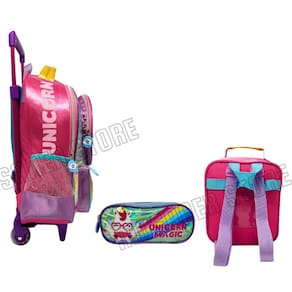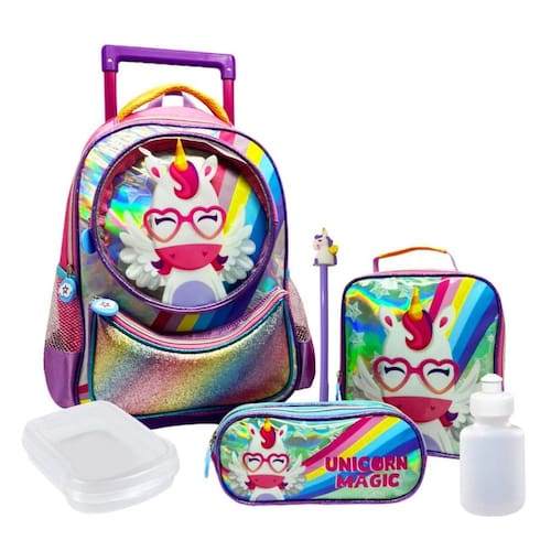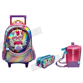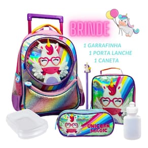 Kit mochila rodinhas feminino unicórnio colorido + lancheira + estojo
