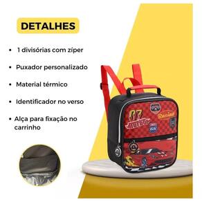 Lancheira: Alcas para a mão e costas, seu interior é feito de manta térmica que ajuda a manter os alimentos gelados ou quentes por mais tempo. Possui também alça para fixação no carrinho e identificador. 100% poliéster 100% policloreto de vinila Medidas: Altura: 22 cm Largura: 20 cm Profundidade: 12 cm
