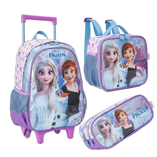 Kit Mochila De Rodinhas Infantil + Lancheira + Estojo Frozen COR: Lilas Tamanho: único Genero: unissex O Kit Escolar Disney Frozen Elsa e Anna, licenciado oficial, oferece um conjunto completo com mochila de rodinhas, lancheira térmica e estojo de 2 compartimentos, ideal para fãs que desejam levar a magia de Frozen para a escola. A mochila é espaçosa e prática, com rodinhas suaves e puxador ajustável, enquanto a lancheira térmica preserva os lanches frescos e saborosos. O estojo com dois compartimentos organiza materiais com charme e funcionalidade. Perfeito para transformar a rotina escolar em uma verdadeira aventura encantada.