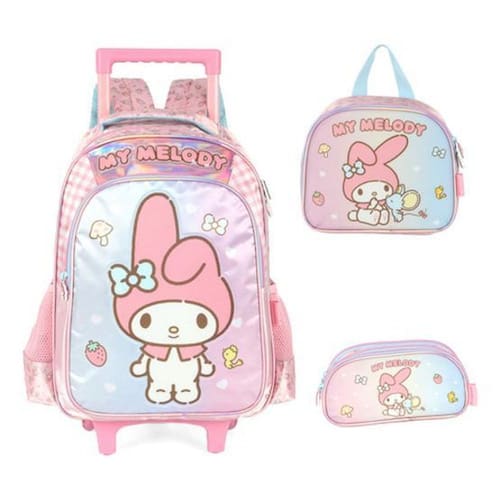 Nova série netflix my melody & kuromi Descrição: Esse lindo kit escolar amigos da hello kitty my melody vai fazer sucesso entre a garotada. Esse modelo conta com 2 compartimentos principais e dois bolsos laterais para colocar a garrafa. Possui 2 rodinhas de silicone e 2 apoiadores frontais para mantê-la em pé. Sua haste metálica é retrátil. Informações mochila com rodinhas; Medidas: altura: 41cm x largura: 31cm x profundidade: 15cm. Peso: 700gr. Capacidade: 21l. Identificador personalizado. Estampa no cetim e personagem em aplique de pvc com glitter Logo em pvc alto relevo Bolso lateral em mesh com brilho Puxadores personalizados. Material: 30% pvc 70% poliéster. Altura da alça retrátil fechada: 45cm. Altura da alça retrátil aberta: 73cm. Informações lancheira térmica; Medidas: altura: 19cm x largura: 23cm x profundidade: 10cm Peso: 300gr Capacidade: 5l Material: 30% pvc 70% poliéster Obs: não acompanha garrafa/potinho Informações estojo triplo; Medidas: altura: 10cm x largura: 22cm x profundidade: 8cm Peso: 100gr Material: 30% pvc 70% poliéster de 6 meses contra defeitos de fabricação. Dicas e cuidados; Proteja os objetos pontiagudos ou cortantes evitando o contato direto com o produto. Guarde o produto e um local seco, fresco e arejado, para evitar a proliferação de fungos que podem danificar o produto. Para limpeza, use apenas água morna e sabão neutro nas partes metálicas somente uma flanela seca. Nunca aplique produtos abrasivos, solventes ou quaisquer agentes químicos. Para secagem, utilize apenas pano seco. Não exponha ao sol e altas temperaturas por um período de tempo prolongado. Apare sempre os fios soltos do tecido, para que eles não se prendam no zíper. Duvida Faça-nos uma pergunta : Marca: Não Informado