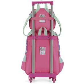 Kit mochila de rodinhas com bolsos laterias em tela com elástico, alças de costas espumadas e reguláveis, silk frontal, bolso frontal com zíper, alça de mão. Lancheira estampada com alça de costas e alça de mão, além de etiquetas personalizadas.