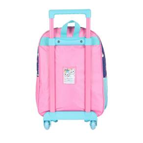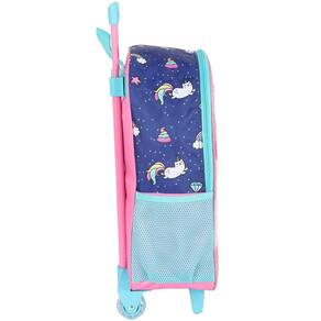 Kit mochila de rodinhas com bolsos laterias em tela com elástico, não possui alças de costas, silk frontal, alça de mão. Lancheira estampada com alça de costas e alça de mão, além de etiquetas personalizadas.