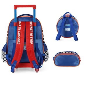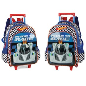 Mochila de rodinhas - é confeccionada em material jacquard com estampa xadrez, parte frontal em efeito metalizado, fechamento com zíper e puxadores personalizados - as alças das costas tem a estampa personalizada. - estampa exclusiva hot wheels: a mochila destaca-se pelo visual moderno e dinâmico. - possui 1 compartimento espaçoso principal e 1 bolso grande frontal com fechamento em zíper e puxadores personalizados, e dois bolsos laterais telados. - possui alça de mão reforçada e alças traseiras acolchoadas e reguláveis. - possui rodinhas de silicone. - possui puxador de haste em metal reforçado. - tamanho aproximado sem considerar a haste a as rodinhas: 44 x 36 x 16cm