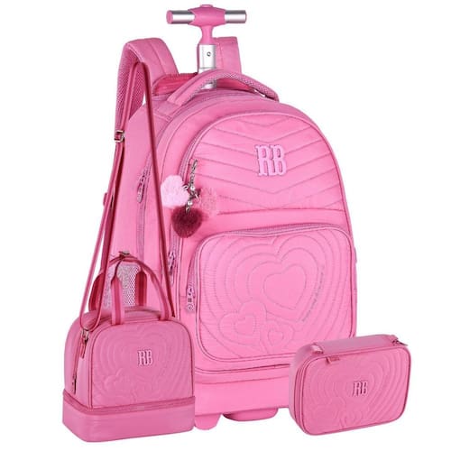 Características mochila: - alça de mão - alça de costas - bolso frontal - bolsos laterais - confeccionados em material soft com matelassê - chaveiro de pompom triplo de corações - logo rb em metal - puxadores de metal na cor da peça - proteção para rodas e alças - zíper tratorado