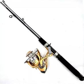 Molinete top de linha com 6 rolamentos e carretel em alumínio, proporcionando um drag de 13,3kg. A vara CMIK, de 1,35m em fibra de vidro e duas partes, suporta até 13,3kg.