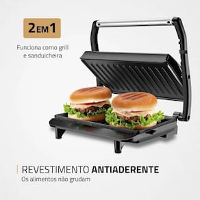 Grill 2 em 1: Prepara sanduíches, carnes, vegetais e muito mais. Chapas duplas onduladas antiaderentes: Grelham por igual sem grudar, sem necessidade de óleo. Grelhas ajustáveis: Facilita o preparo de alimentos de diferentes espessuras. Acabamento em inox e base antiderrapante: Mais durabilidade, segurança e estabilidade. Alça frontal com toque frio e lâmpada piloto: Manuseio seguro e fácil identificação do funcionamento. Potência: 1000W | Peso: 1,100 kg | Dimensões compactas para fácil armazenamento