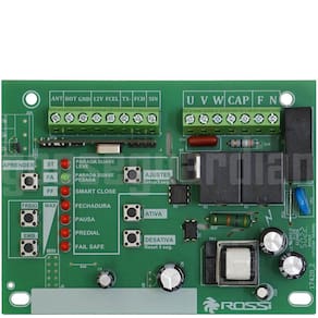 CARACTERÍSTICAS DO MOTOR • Potência de 0,25 ou 1/4CV (portões até 600kg balanceado) • Engrenagem externa metálica 17 Dentes • Coroa e sem fim interno (engrenagens) metálicas • Abre portão de 4m em 14,1 seg. • Suporta até 30 aberturas por hora (ciclos/hora) • Placa Eletrônica de Comando Rossi