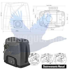 CARACTERÍSTICAS DO MOTOR • Potência de 0,25 ou 1/4CV (portões até 600kg balanceado) • Engrenagem externa metálica 17 Dentes • Coroa e sem fim interno (engrenagens) metálicas • Abre portão de 4m em 14,1 seg. • Suporta até 30 aberturas por hora (ciclos/hora) • Placa NKXH30: embreagem; freio; parada suave; fim de curso sensor HALL; memoriza 28 botões; receptor 433 Mhz Rolling; função predial; fechamento automático; entrada botoeira; entrada sinaleira; entrada fotocélula; saída para luz de garagem.