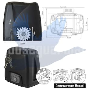 CARACTERÍSTICAS DO MOTOR • Potência de 0,2 ou 1/5HP (portões até 350kg balanceado) • Engrenagem externa metálica 17 Dentes • Coroa e sem fim interno (engrenagens) metálicas • Abre portão de 4m em 14,1 seg. • Suporta até 15 aberturas por hora (ciclos/hora) • Placa WKXHB90: fim de curso sensor HALL; Parada Suave (habilitada de fábrica); memoriza 85 botões; receptor 433 Mhz Rolling Code; entrada botoeira; entrada fotocélula.