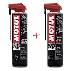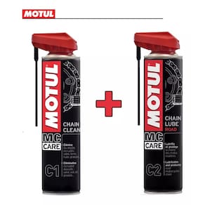 KIT COMPOSTO POR:- 1 UND MOTUL MC CARE C1 CHAIN CLEAN - 400ml- 1 UND MOTUL MC CARE C2 CHAIN LUBE ROAD - 400mlMOTUL MC CARE C1 CHAIN CLEANO MOTUL Chain Clean limpa todo tipo de correntes de motocicleta (estrada e fora-de-estrada) e de outros veículos (bicicletas, motonetas, karts, quadriciclos e outros).MOTUL MC CARE C2 CHAIN LUBE ROADTodos os tipos de correntes: standard e com O-RING, X-RING, Z-RING. Motocicletas de rua, karts. Especialmente recomendado para motocicletas de alta velocidade. O MOTUL CHAIN LUBE ROAD adere à corrente mesmo em altas velocidades.