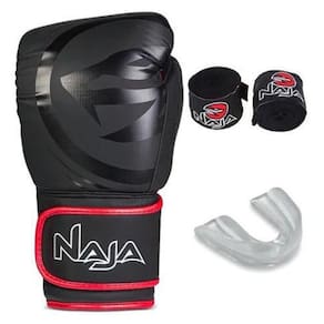Conteúdo da embalagem: 01x par de luvas naja+ 01x protetor bucal transparente + 01x par de bandagem naja + 01x sacola para transporte da luva. O kit naja black line, possui revestimento em couro sintético e enchimento em n.T, que oferece precisão no molde para um encaixe perfeito. Estudos internacionais científicos resultam numa matéria-prima inovadora para o melhor enchimento da luva. O material além de tudo amortece o impacto e dá ao atleta segurança e conforto.