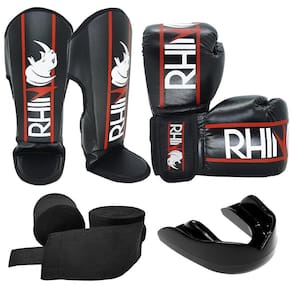 O kit reúne os itens básicos para treinamento de Boxe e Muay Thai ou Kickboxing. Todos os produtos são da marca nacional Rhino.