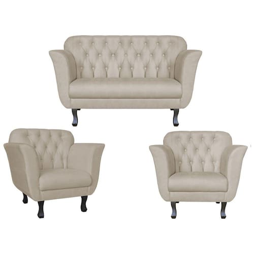 Kit Namoradeira + 2 Poltronas Decorativa Dália Couro Bege Pés Madeira Ms Decor